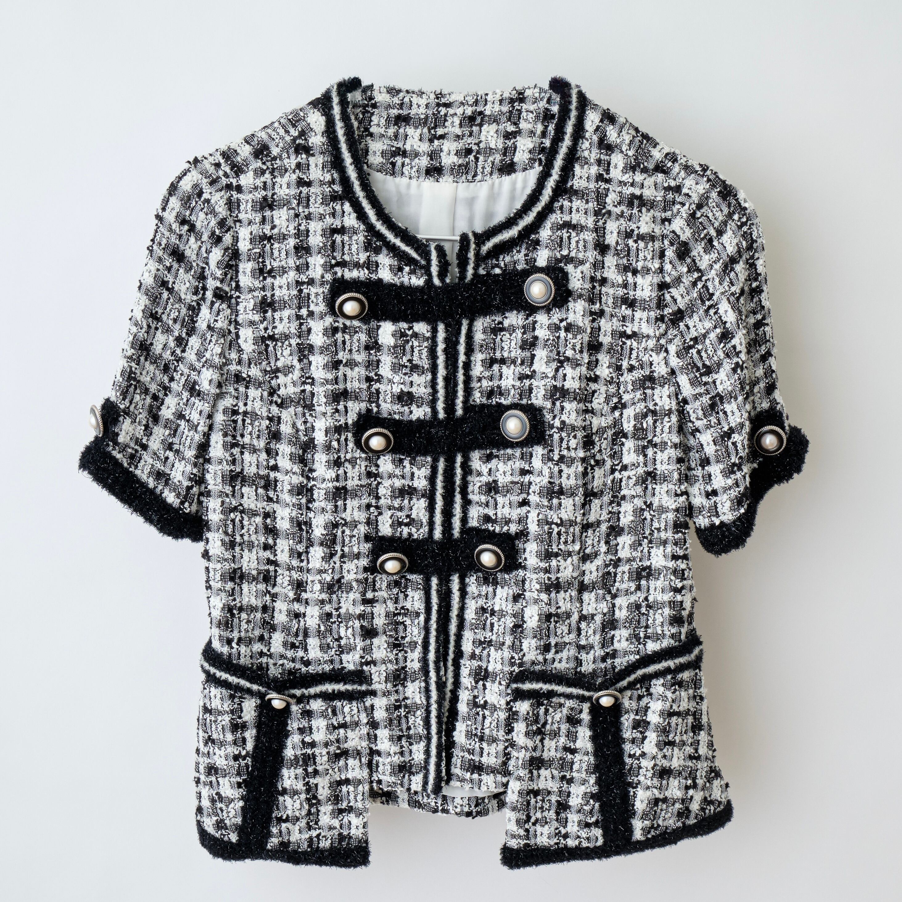 上品なツィード素材で仕立てられた半袖ジャケットは、シックで洗練された印象を与える一着です。軽やかで通気性の良い素材を使用しており、快適な着心地を楽しむことができます。デイリーコーデはもちろん、オフィスや特別なイベントにもぴったりなアイテムです。