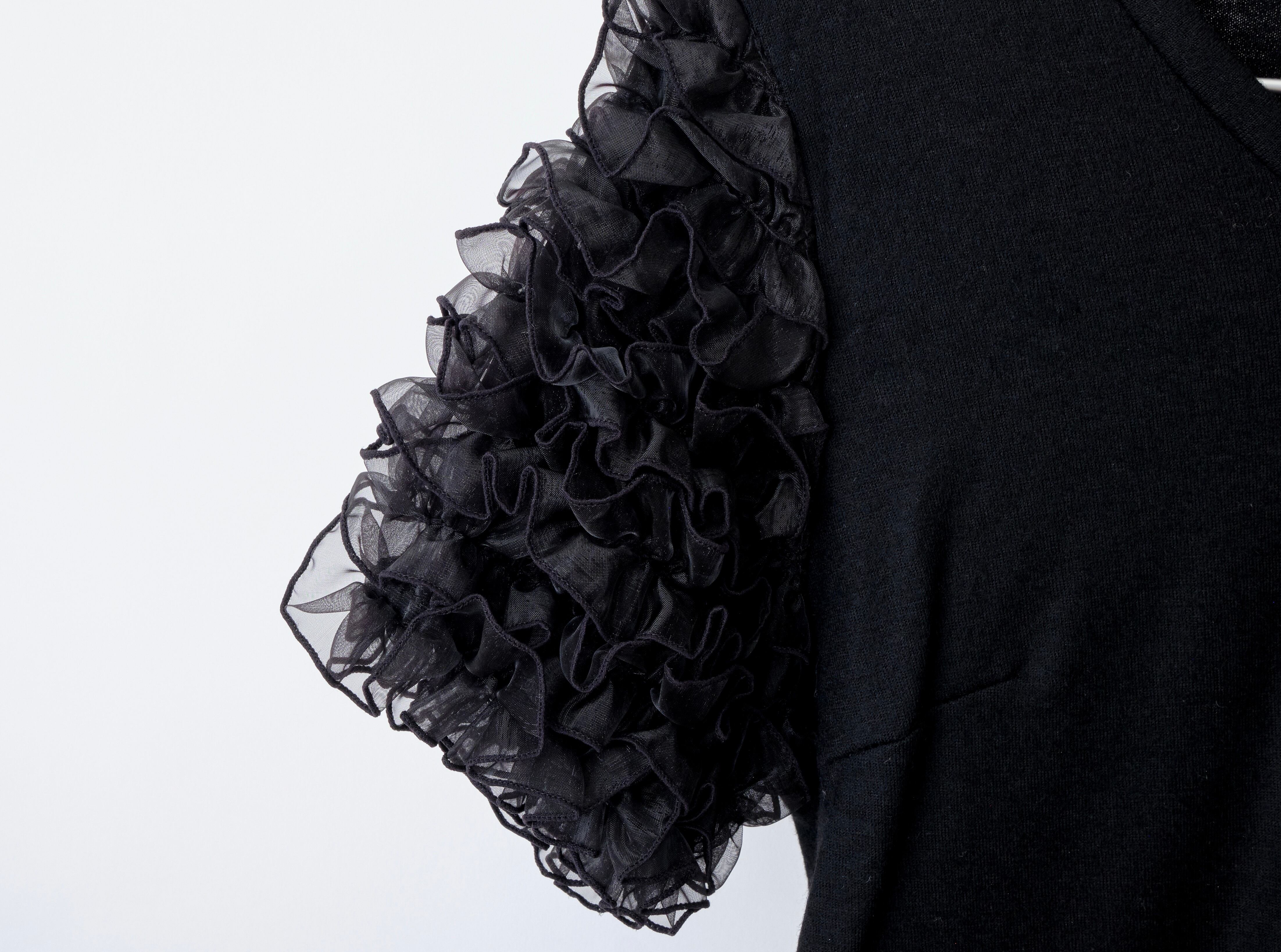 優雅なVネックデザインが特徴で、フェミニンさとカジュアルさを見事に融合させた魅力的なアイテムです。軽やかなチュール素材を使用しており、通気性と快適さを兼ね備えた着心地を実現しています。デイリーユースはもちろん、特別なシーンにもぴったりな一着です。